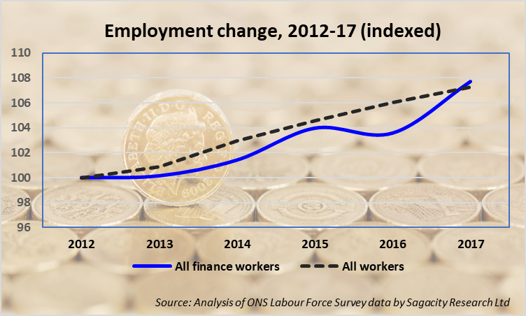 Looking at the FS sector/it’s importance to the UK it is noted that though there are plenty of reports on the industry vertical, there’s not so much on the people working in finance jobs more generally (i.e. inside/outside the FS sector) – so as a heads up – the number of people working in financial occupations in the UK topped 1.9m in 2017 – up 4% on the previous year (that’s compared with a growth rate of just 1.2% for all occupational groups). and, the biggest YoY changes (increases) in finance occupations were recorded for; Pensions/insurance clerks & assistants (up 18%), Book Keepers/equivalent (up 16%), and Finance Officers (up 14%). By comparison, the number of Chartered accountants in the workforce was seen to fall by 10% over the 2016-17 period.