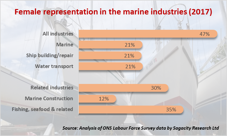 In 2017 women accounted for just 21% of individuals working in the marine sector (in this case defined as: ship building /repair and sea/coastal/inland water transport) compared with 47% within the workforce as a whole. Representation was much higher however in the ‘related industries’ (supply/distribution of seafood/related) at 35%.