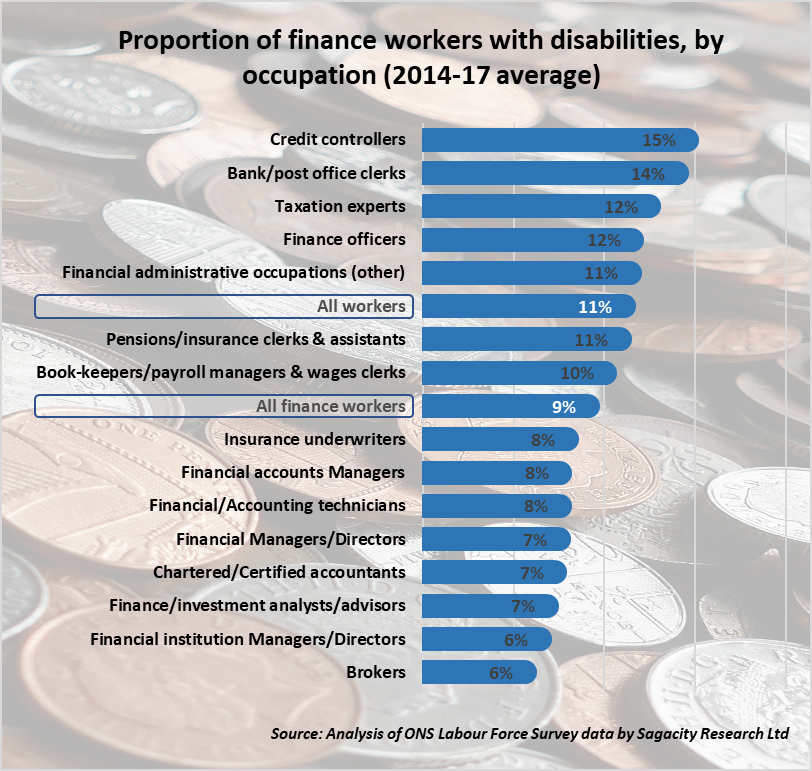 During 2017 approximately 10% of people working in finance positions were classed as disabled (i.e. according to definitions set out within the 2010 Equality Act) – compared with 12% amongst the workforce as a whole. Moreover this ‘lag’ of 2 percentage points is apparent when looking at each of the previous years for which data are available (2013 onward). Lastly, when considering specific finance occupations, it appears that people with disabilities are notably less well represented amongst higher level occupations, and over the 2014-17 period just 6-7% of those working as; Financial Managers/ Directors, Financial institution Managers / Directors, Chartered/Certified accountants or Brokers were thought to have some form of disability (nb. a longer time frame is used here to meet ONS guidelines on data release and hence the finance/overall figures do not match those for 2017 only).