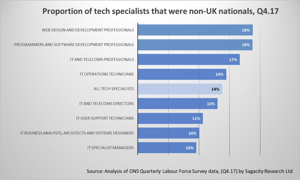 Latest data from ONS shows that during the last quarter of 2017 there were an estimated 186,000 tech specialists in the UK with non-UK nationality (i.e. 14% of the total at that time). This was a higher proportion than that registered for the workforce as a whole (11%), amongst which, an estimated 3,563,000 people were non-UK nationals. The proportion of tech specialists that were non-UK nationals was however, well below that registered for many other occupations, notably ‘packers, bottlers, canners and fillers’ amongst whom, less than half (47%) had UK nationality. I also noted that, though the proportion of tech specialists that are EU nationals appears much the same as for workers as a whole (6% vs 7%), the proportion of tech specialists that were of Asian nationality was double that registered amongst the wider workforce (4% vs 2%).
