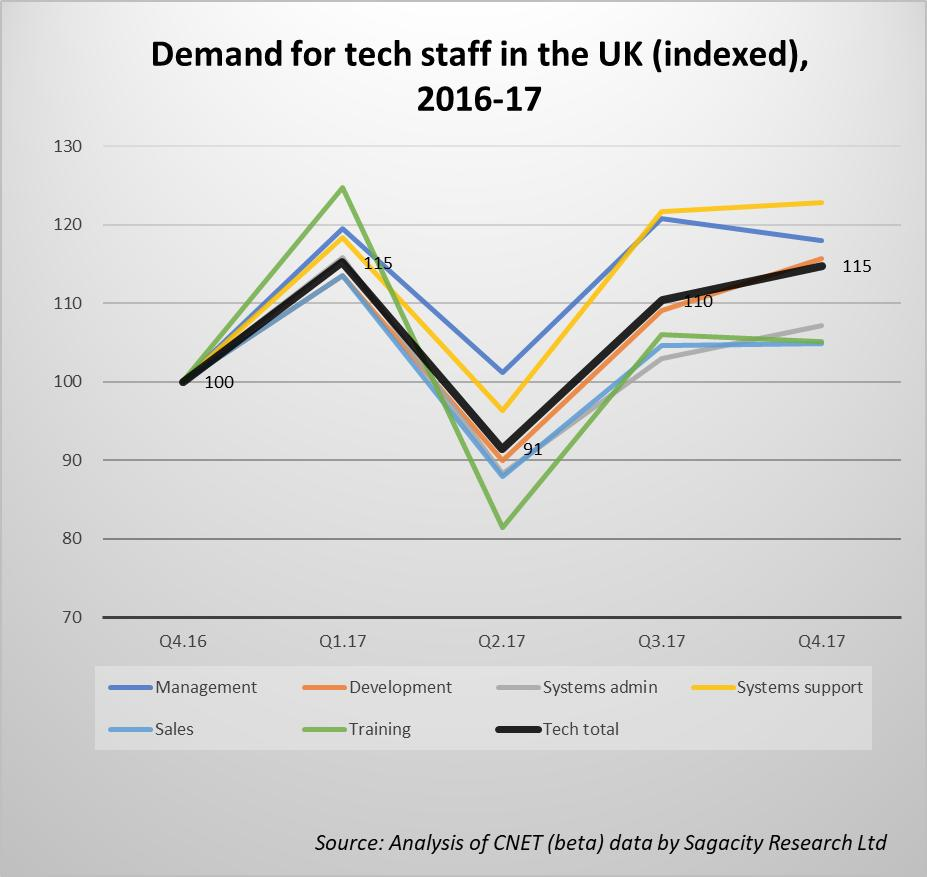Interesting beta data from a new(ish) European project (aiming to provide a free vacancy data tracking service) shows there were approximately 59,000 advertised vacancies for tech specialists in the UK during the final quarter of 2017 – a 15% increase on the previous year. The most notable increase in demand over the Q4.16-7 period was for telecoms engineers (up 118%) though demand for networking professionals as a group was down by 9%. Development positions – the mainstay of the tech market (56% of advertised vacancies in Q4.17) were associated with a demand increase of 16% over the year. Please note that: (a) the data is in beta at the moment and, (b) the figures/changes quoted here are quarterly averages – drop me a note if you need any more detail!